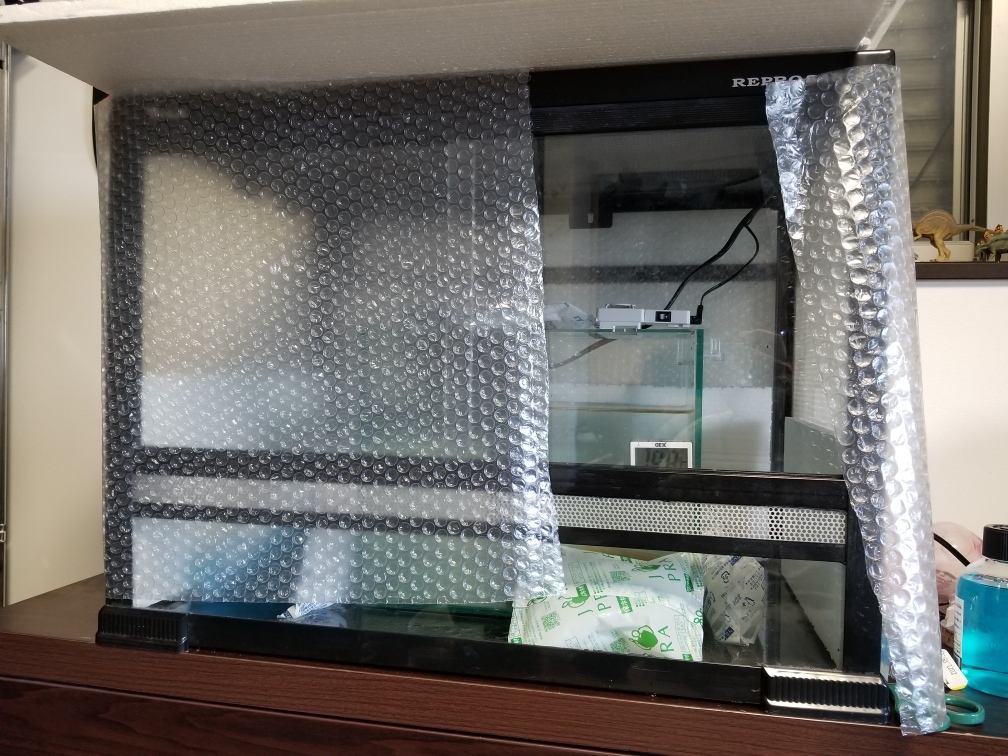 REPURO645の中に、外掛けフィルター、ファンを設置した水槽ごと入れて、